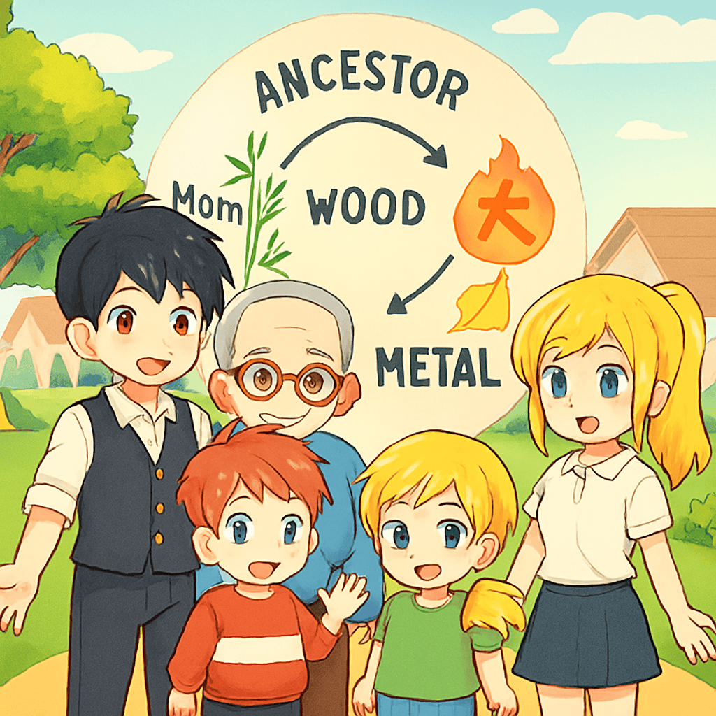 🔥 Family Correspondence with Five ElementsFather → FireFire symbolizes brightness, leadership, passion. The father is like the “sun” in the